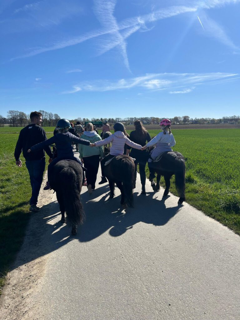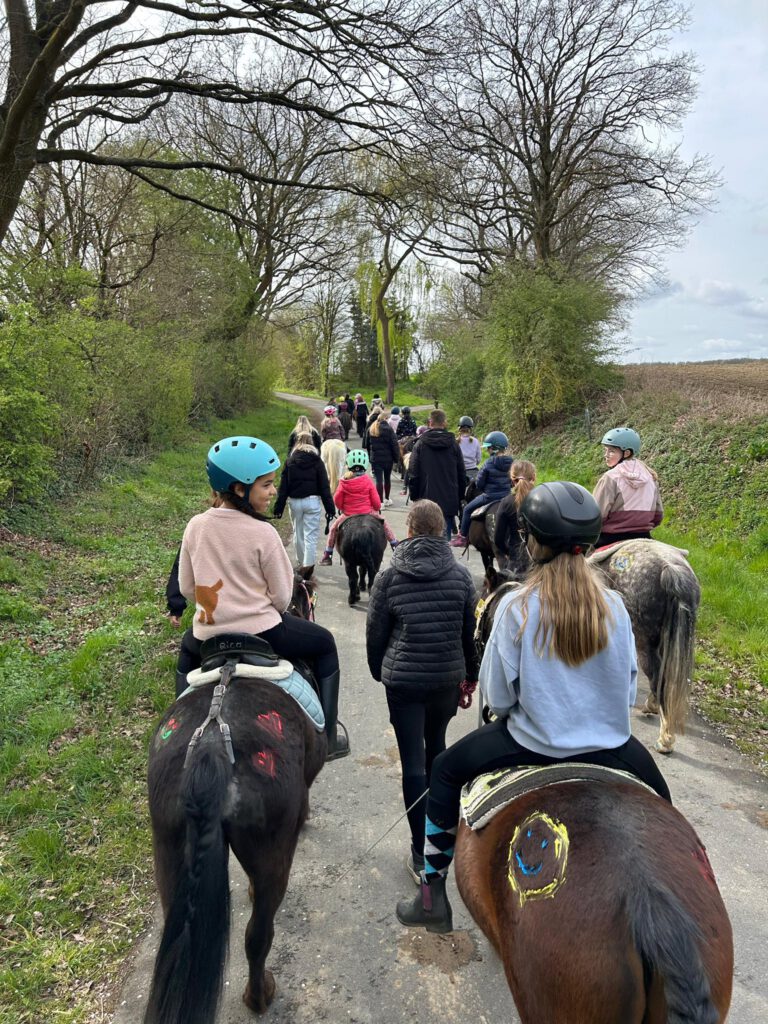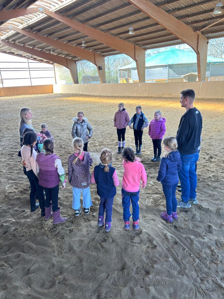 In der zweiten Ferienwoche der Frühjahrsferien erlebten Kinder im Alter von 6–10 Jahren drei rundum schöne Tage voller Bewegung, Natur und Kreativität: Nach einer gemeinsamen Begrüßung und einem kleinen Snack ging es täglich hinaus zu einem Ausritt durch die Umgebung – begleitet von frischer Frühlingsluft und zeitweise sonnigem Wetter. Im Anschluss stärkten sich alle bei einem leckeren Mittagessen, bevor Spiel, Spaß und kreative Momente auf dem Programm standen. Mit viel Fantasie entstanden dabei liebevoll gestaltete und bemalte Blumen.